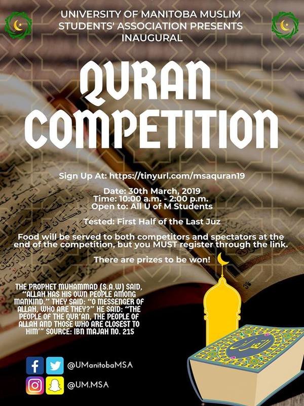Assalamualaikum! It is with great excitement that we are announcing our Inaugural Quran Competition. All students U of M are wellcome!