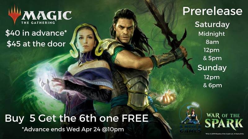 A Muse N Games is proud to announce we are hosting six War of the Spark Prerelease events for the newest Magic: the Gathering set! On Saturday, April 27th we are hosting a midnight, 8am, noon, and 5:00 pm events. On Sunday, April 28th we are hosting events at noon and 6:00 pm. War of the Spark prerelease events will start promptly with deck construction at the listed start times.