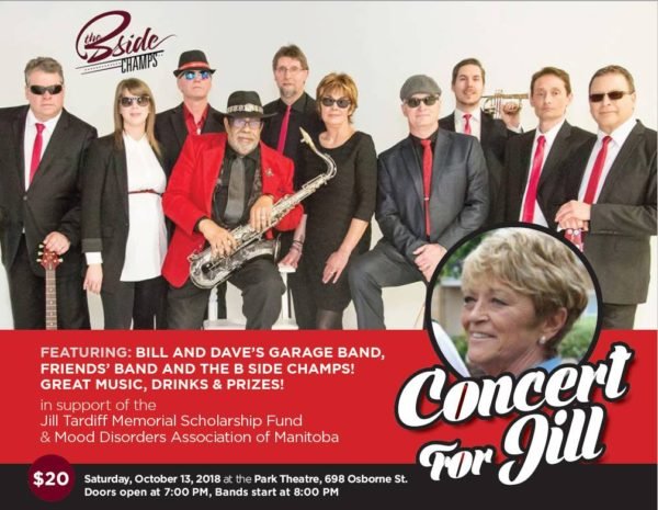 A night of music, prizes, drinks and fun in support of the Jill Tardiff Memorial Scholarship Fund and Mood Disorders Association of Manitoba. Performances by the B Side Champs, Bill and Dave's Garage Band and more.