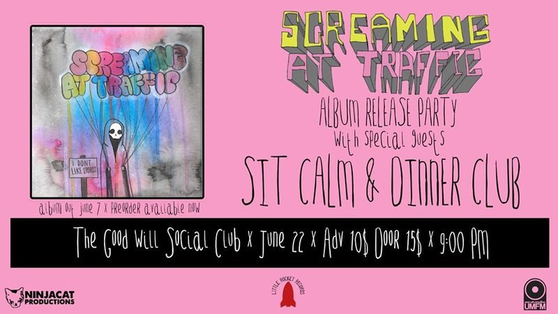 Screaming at Traffic are happy to be throwing a release party for their debut album, "I Don't Like Sports" at The Good Will Social Club in Winnipeg with local pals Sit Calm and Dinner Club on June 22nd, 2019!