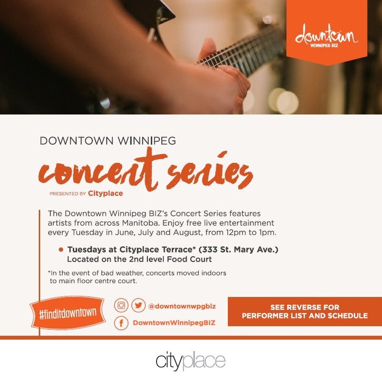 Each Tuesday in June, July and August, join Cityplace and the Downtown BIZ for a free performance from 12-1pm on the Cityplace outdoor terrace. In case of bad weather, the performance will be moved to centre court.