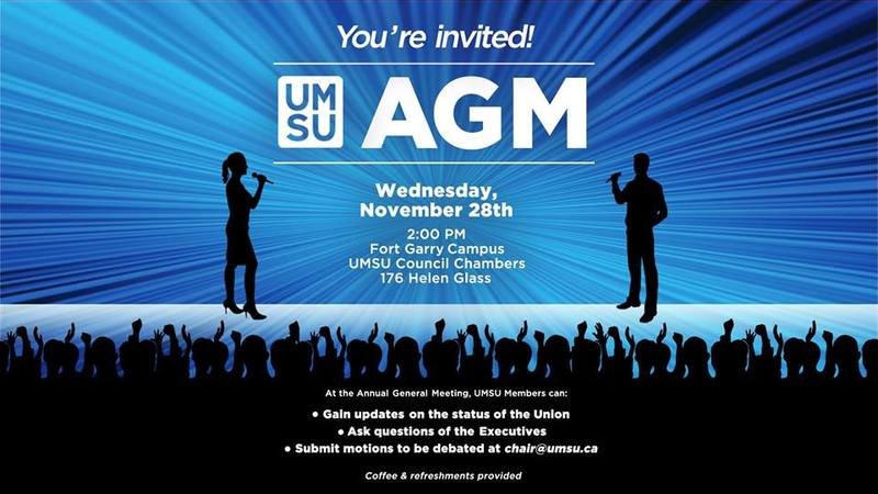 University of Manitoba invites all students to attend UMSU's Fall Annual General Meeting (AGM). They will have an opportunity to meet elected UMSU representatives, gain updates on the status of the Union and of course to ask the necessary questions of the Executives.