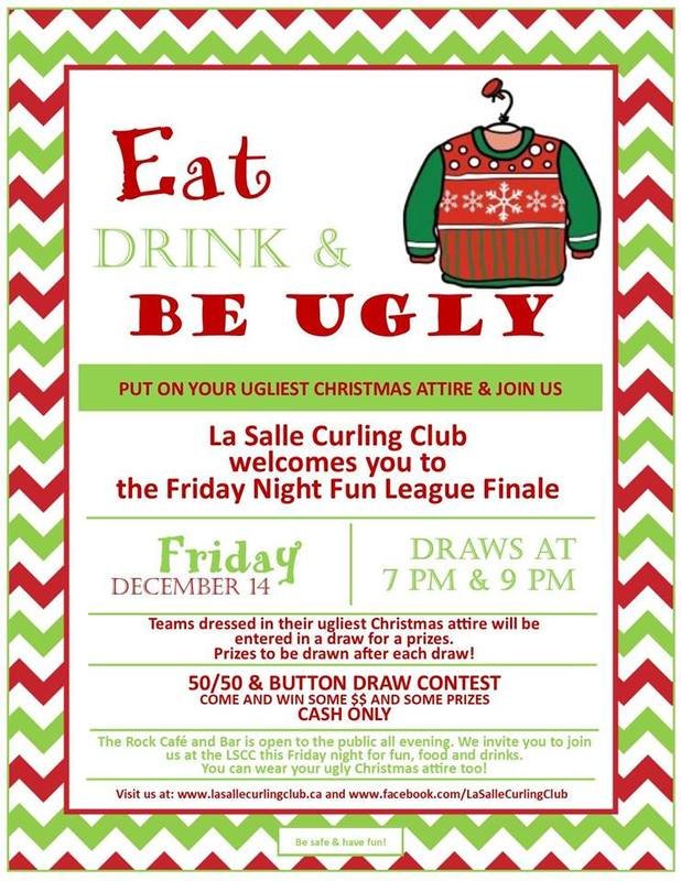 Get your team dressed in their ugliest holiday attire, enter the 50/50 and button draw contest for your chance to win prizes! Even if you have nothing to do with curling come to La Salle Curling Club anyway!